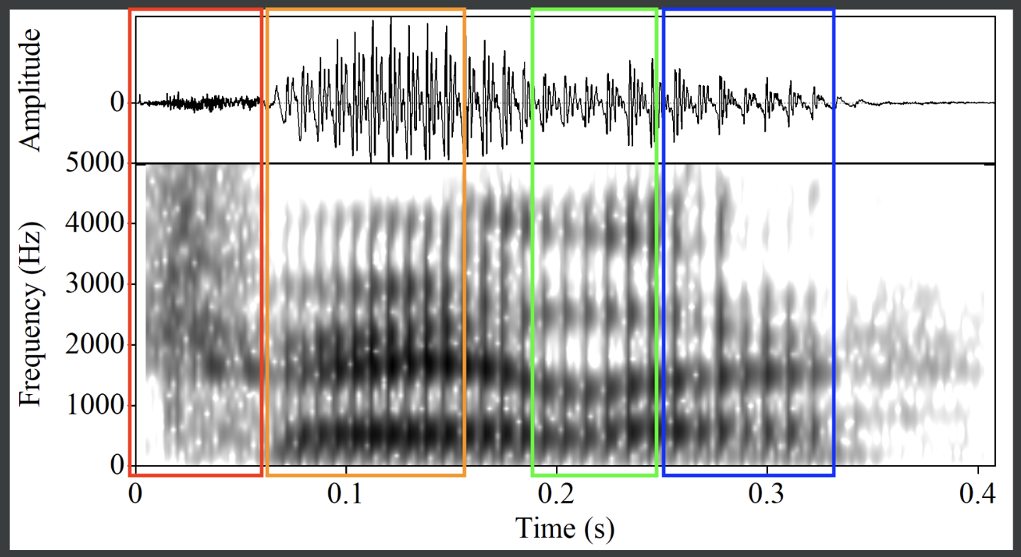 - Segment 4: A stop with closure and short-lag VOT. All the formants dip down before, which makes me think bilabial. It’s probably voiceless since the segment after is voiceless.