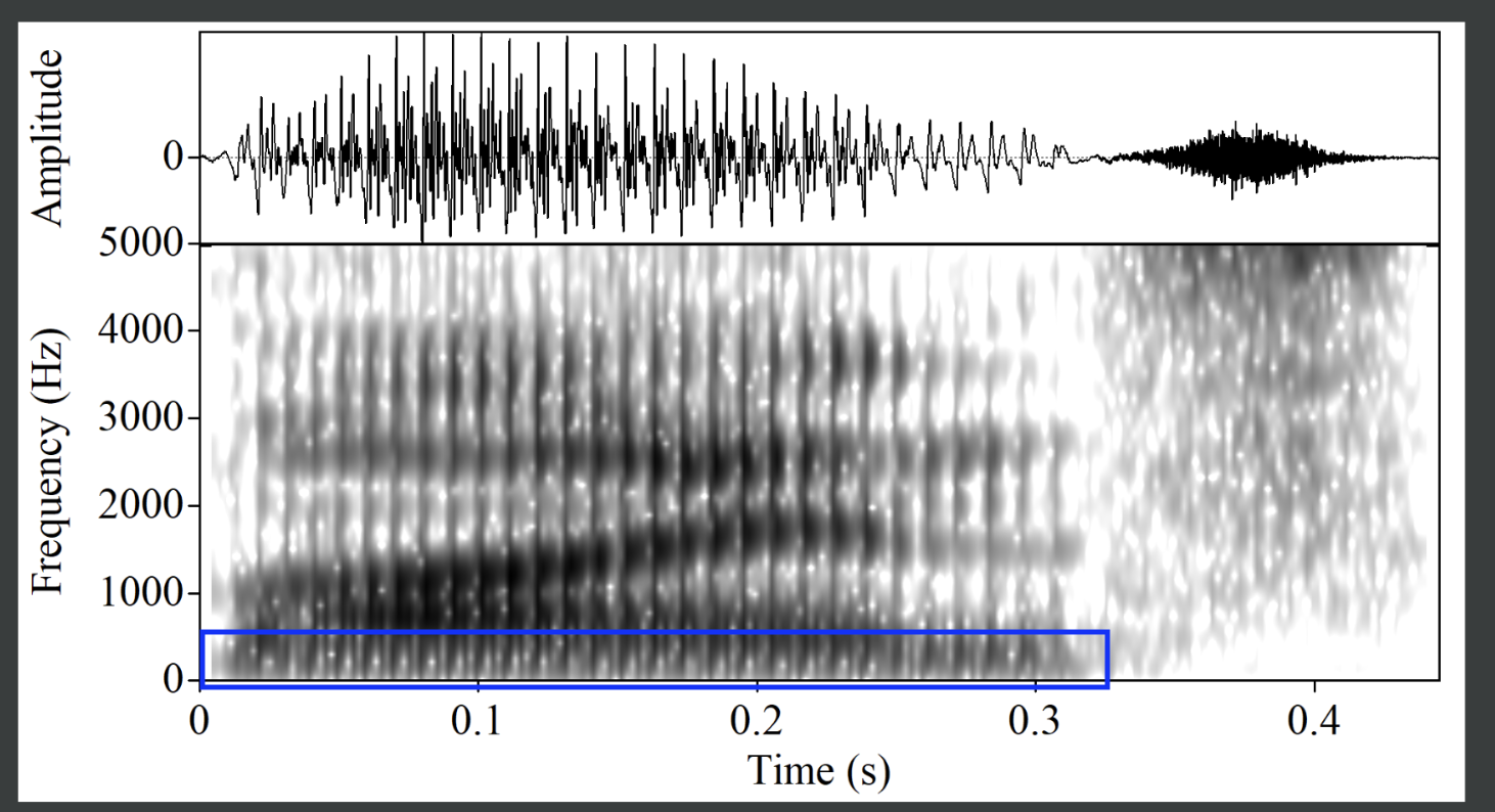 - Segment 4: Tons of zeroing in the formants, low amplitude, almost invisible formants. The options here are nasal or non-sibilant fricative. There’s voicing throughout, so that narrows down to [m, n, v, ð]