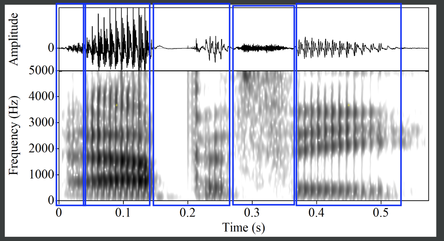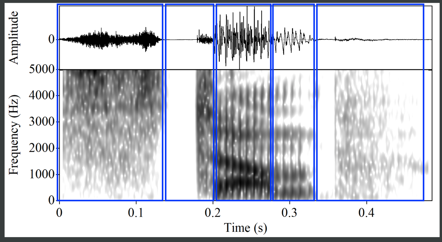 - Segment 5: Voiceless, frication noise, center of energy above 500 Hz = [s].