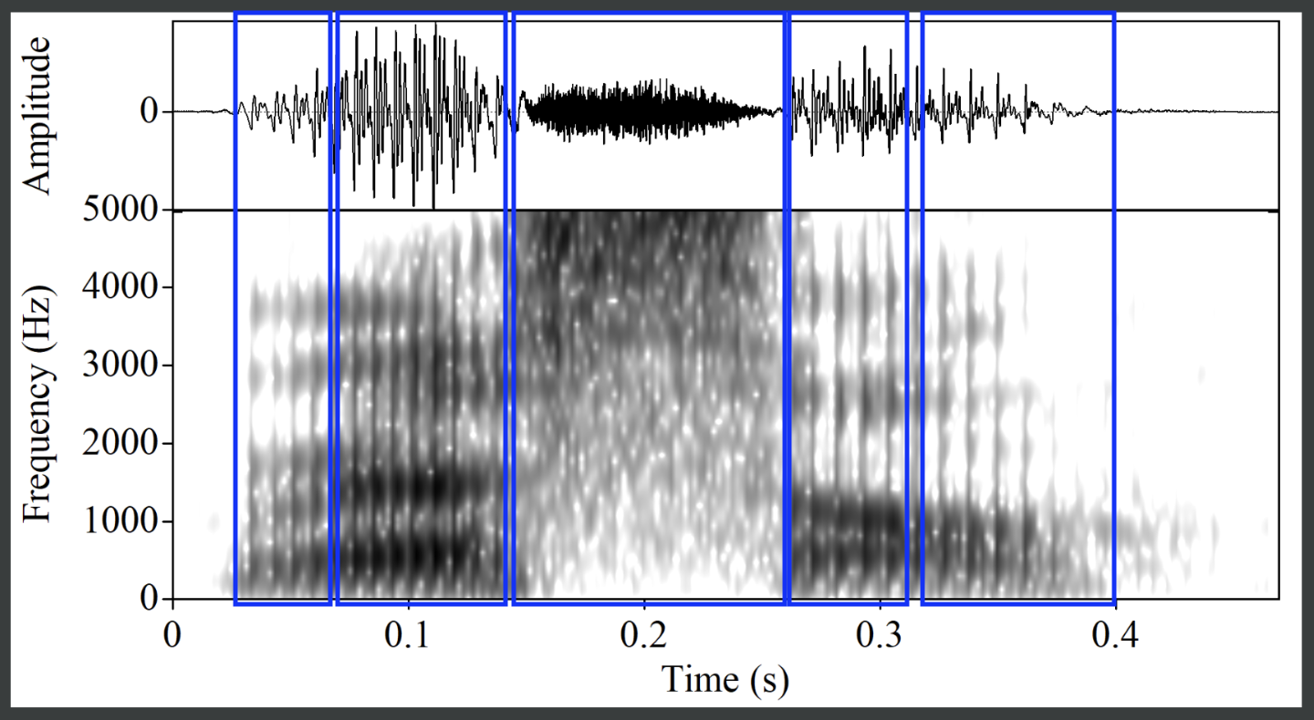 - Segment 5: This is the segment I’m least confident in. The amplitude from the vowel dies gradually, so there may be a heavily released nasal, or some kind of word-final non-sibilant fricative, which is uncommon in English. I don’t see evidence of a release burst in the spectrogram or the waveform, so learning against a stop.